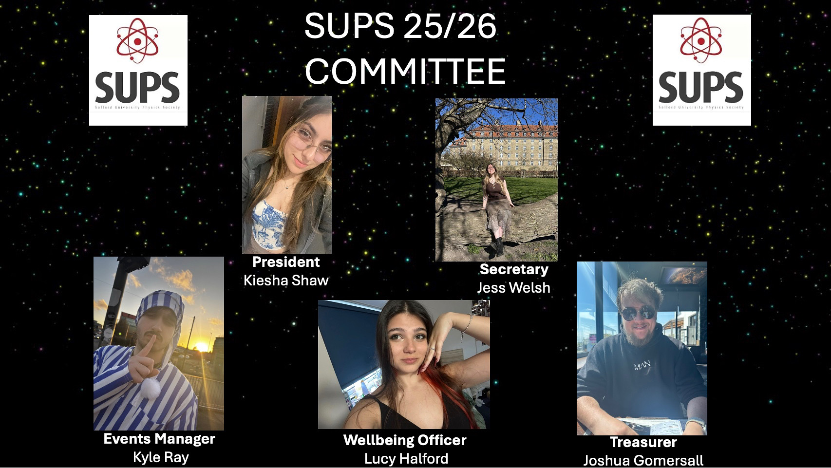 Physics Society Salford University Physics Society (SUPS) Facebook | Students’ Union | Linktr.ee SUPS Committee 2025/2026 SUPS Committee 25/26
