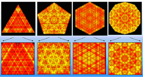 At the University of Salford, we subsequently derived two new compact formulations of Fresnel diffraction arising from closed apertures of arbitrary shape. This overcame the earlier modelling limitations, and has allowed us to calculate fractal laser mode patterns with an arbitrary level of detail [31,32]. The detail permitted is only limited by the Fresnel conditions themselves. Figure 3 shows results from some sample calculations, involving the following aperture shapes: triangle, pentagon, hexagon, and decagon. In each case, one can magnify the central details of the laser mode to see even more of the structure present (shown in the frames below).